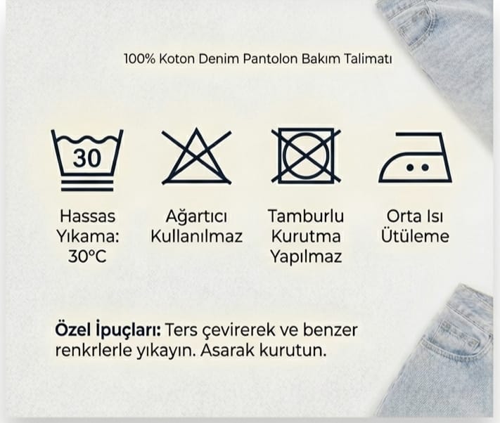Ütüleme: Gerekirse, orta sıcaklıkta ve kumaş hafif nemliyken tersinden ütüleyebilirsiniz.